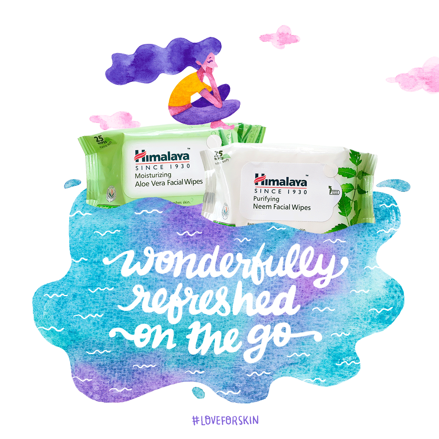 Himalaya Personal Care offers contemporary Ayurveda products for head-to-heel personal care needs. I was asked to conceptualize and design a digital marketing campaign that incorporated moving and static images to promote their Neem Kit and brand new range of Facial Wipes, using watercolor illustrations targeted to a teenage female audience.
